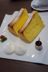 お勧めのシフォントーストを頂く。 2カットをトーストしてバターをカット面に塗っている。 バターの量とトーストしたシフォンの量が丁度いい! カリっふわっとのバランスが絶妙。 焼く前のシフォンケーキも食べたくて持ち帰る。 生地はどの部分もふわっと蒸しパン的で甘めの食べやすい感じ。