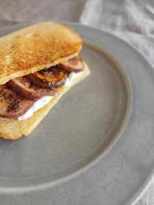 シフォンケーキもバターで軽く焼き、その上にクリームチーズと焼き無花果を乗せててサンド。 焼かれてジューシーさと甘味が増した無花果にクリームチーズの濃厚さと塩気、そして甘すぎないシフォンケーキの組合せは軽食にもなりそう。甘すぎず重すぎずいい感じかも。